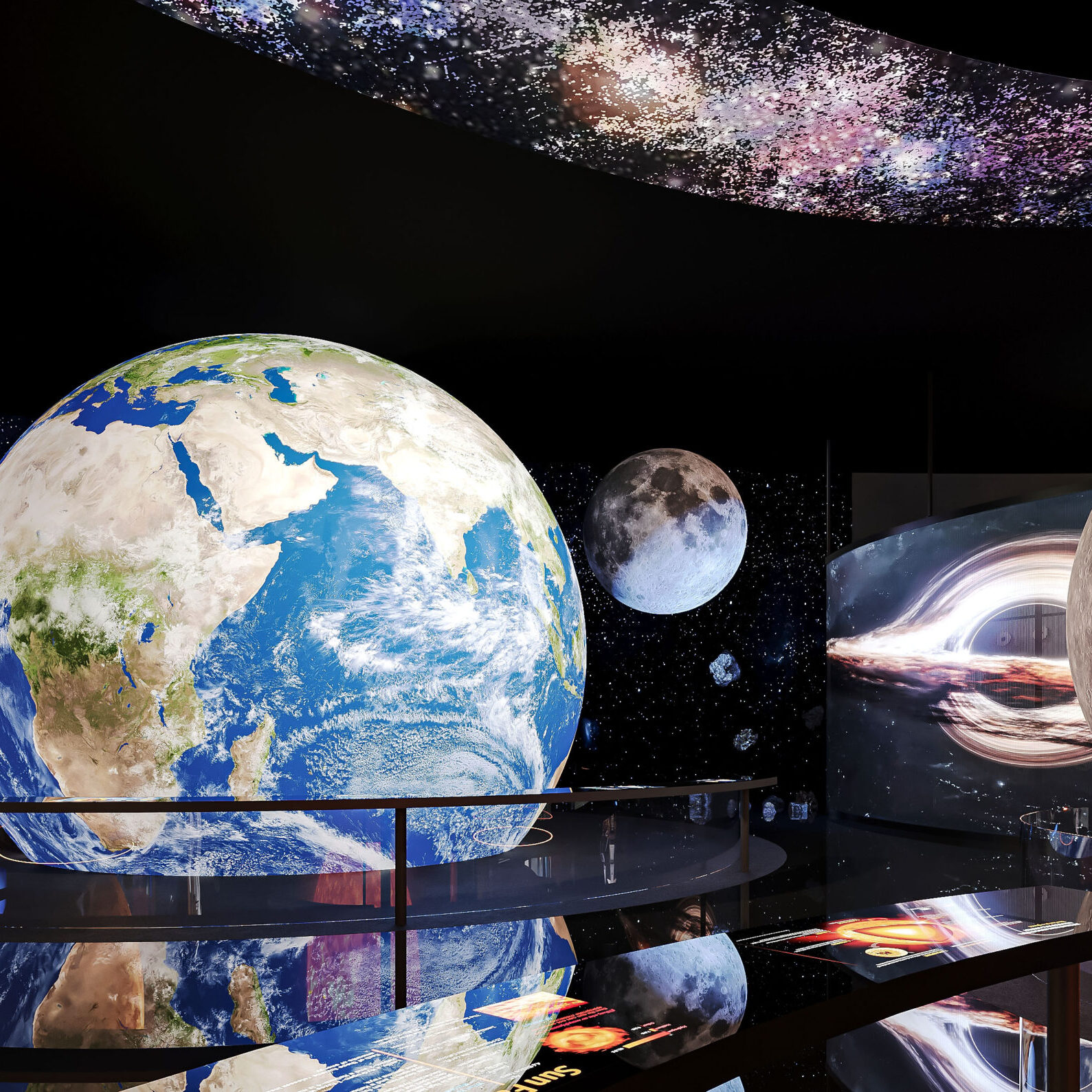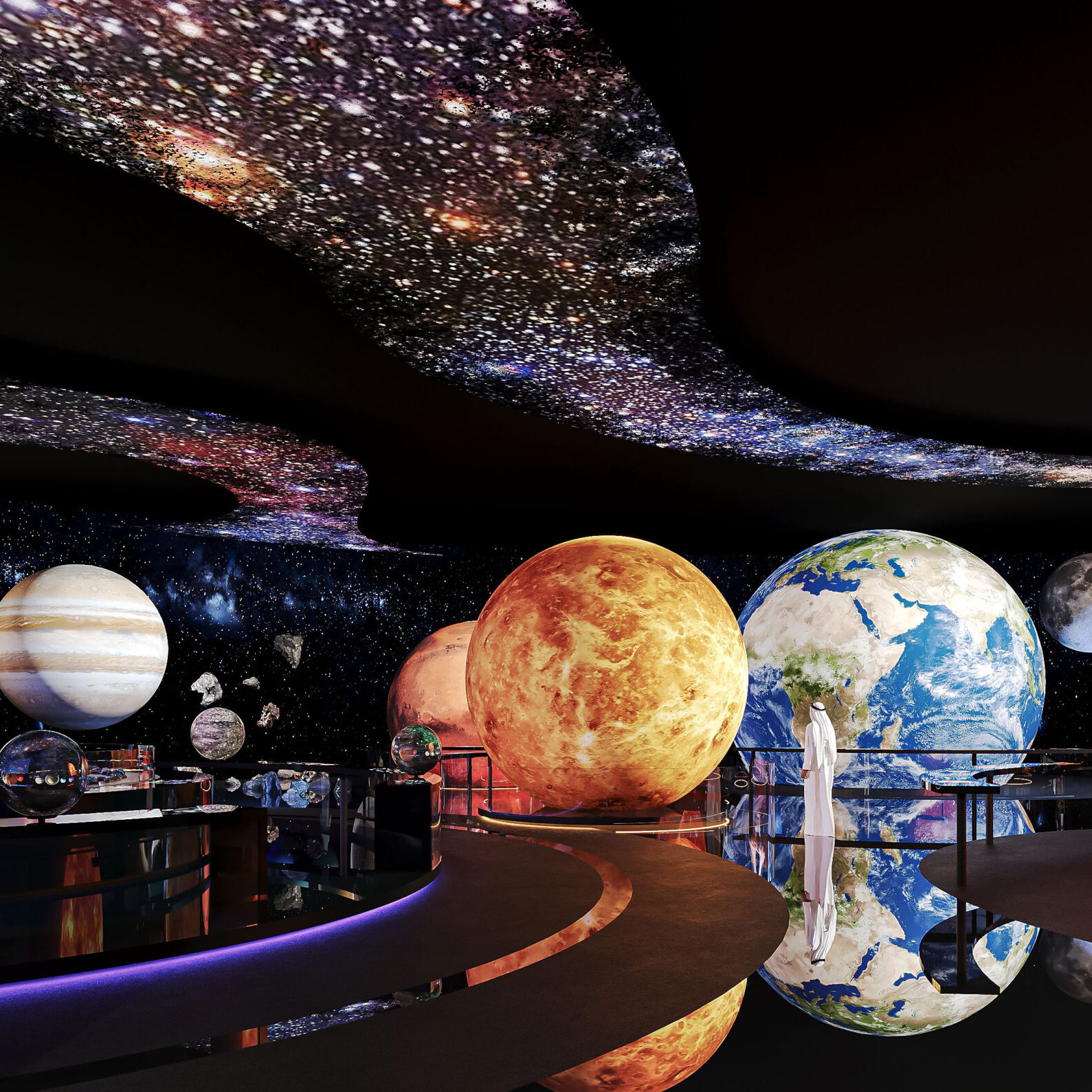 It is inspired by the vastness of the cosmos, celestial patterns, and futuristic aesthetics. The space integrates cutting-edge technology with immersive environments that evoke the mysteries of the universe. The design prioritizes functionality for education, research, and engagement while incorporating a sense of wonder and exploration.