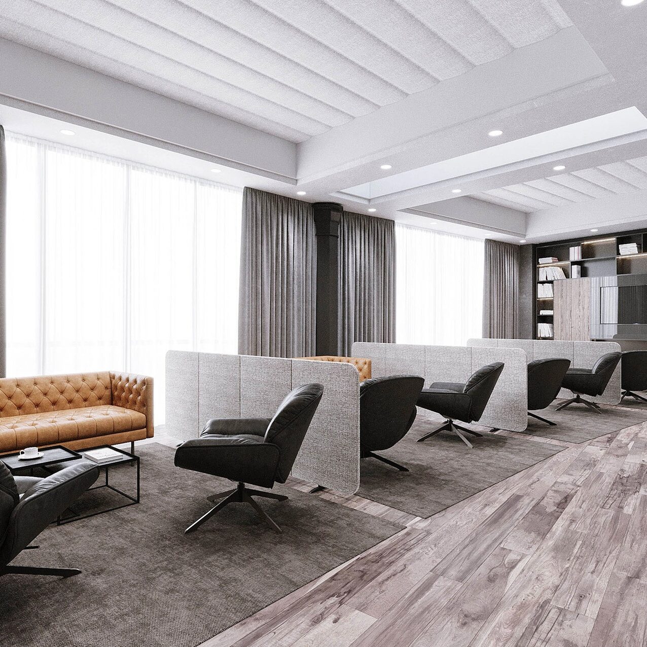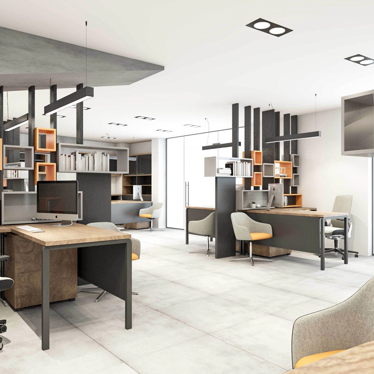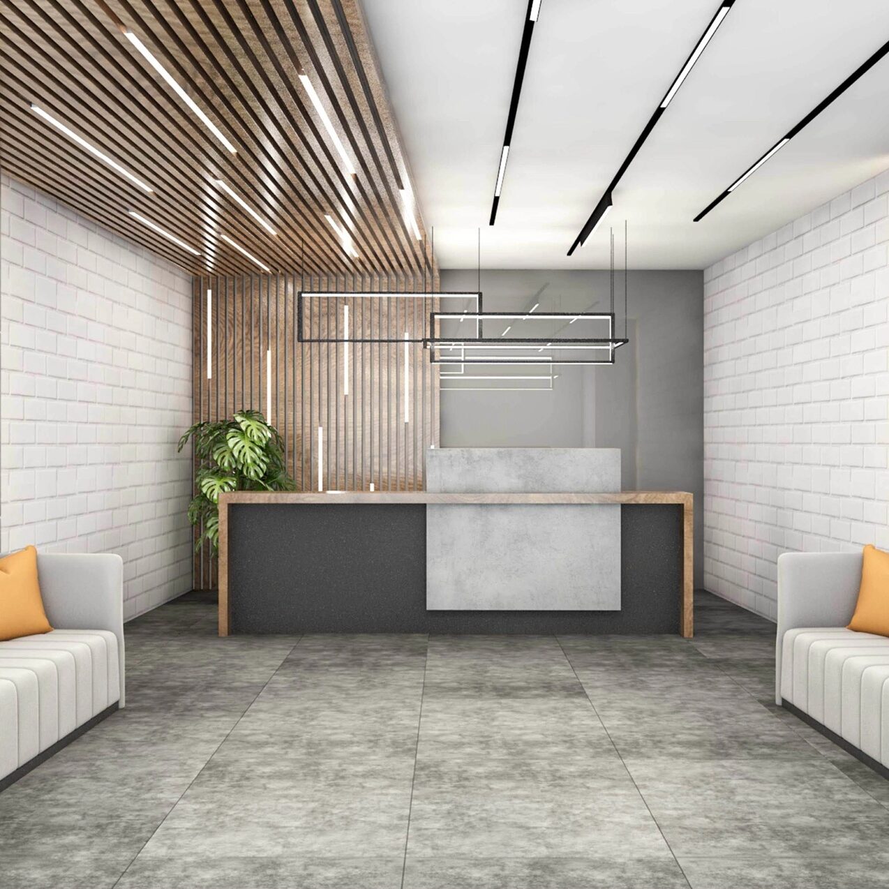 The design of the office features a raw yet sophisticated aesthetic, with concrete-effect flooring and walls that create an industrial-inspired backdrop. Warm wooden elements are strategically incorporated into the ceiling and select wall sections, adding texture and contrast. This fusion of cool and warm materials results in a modern, balanced workspace that feels both stylish and inviting.