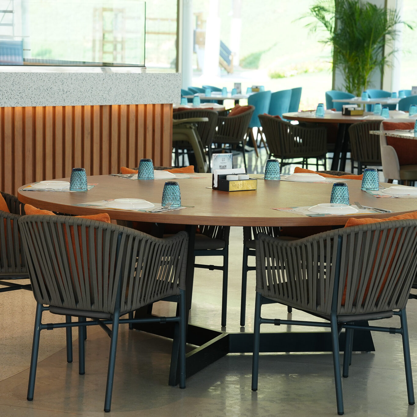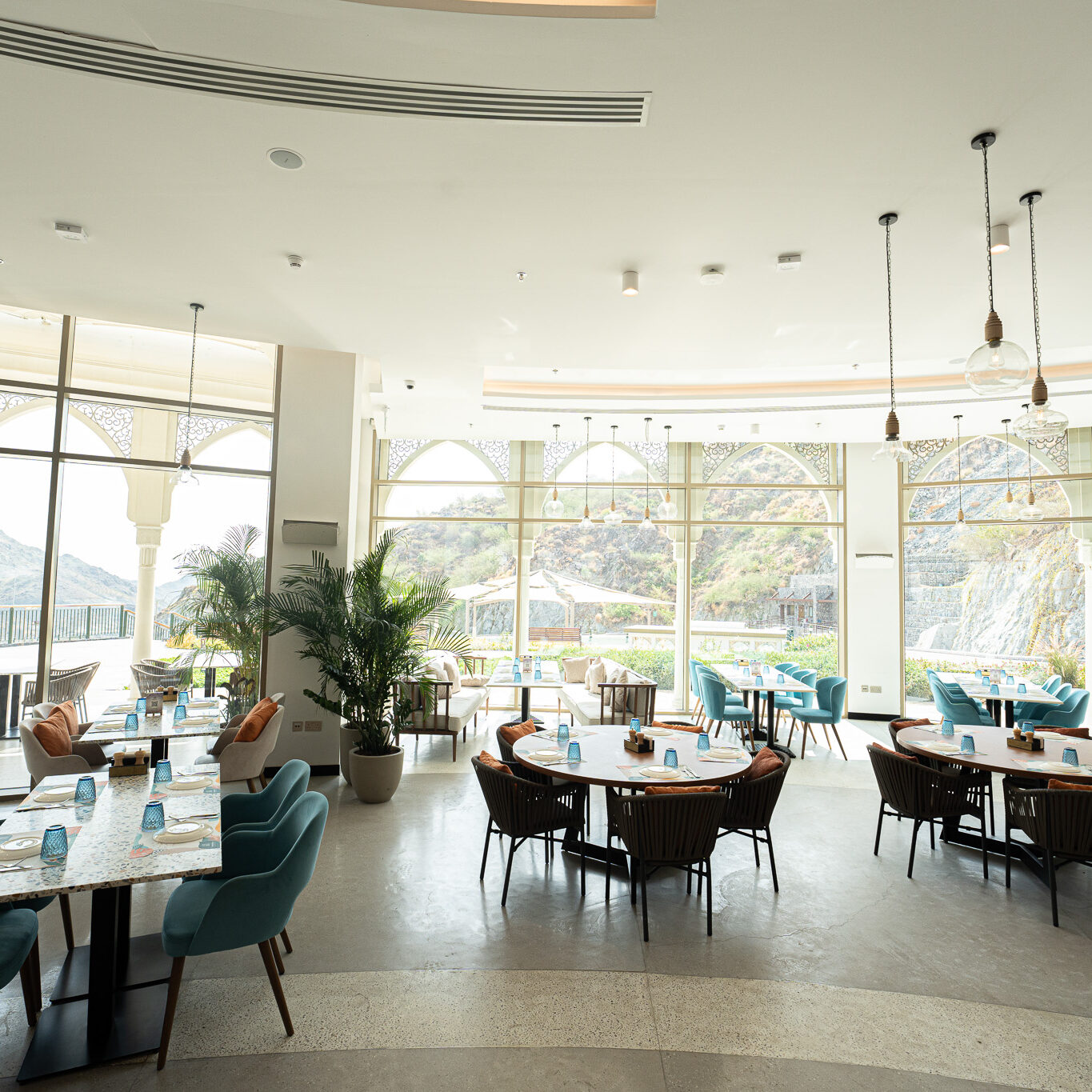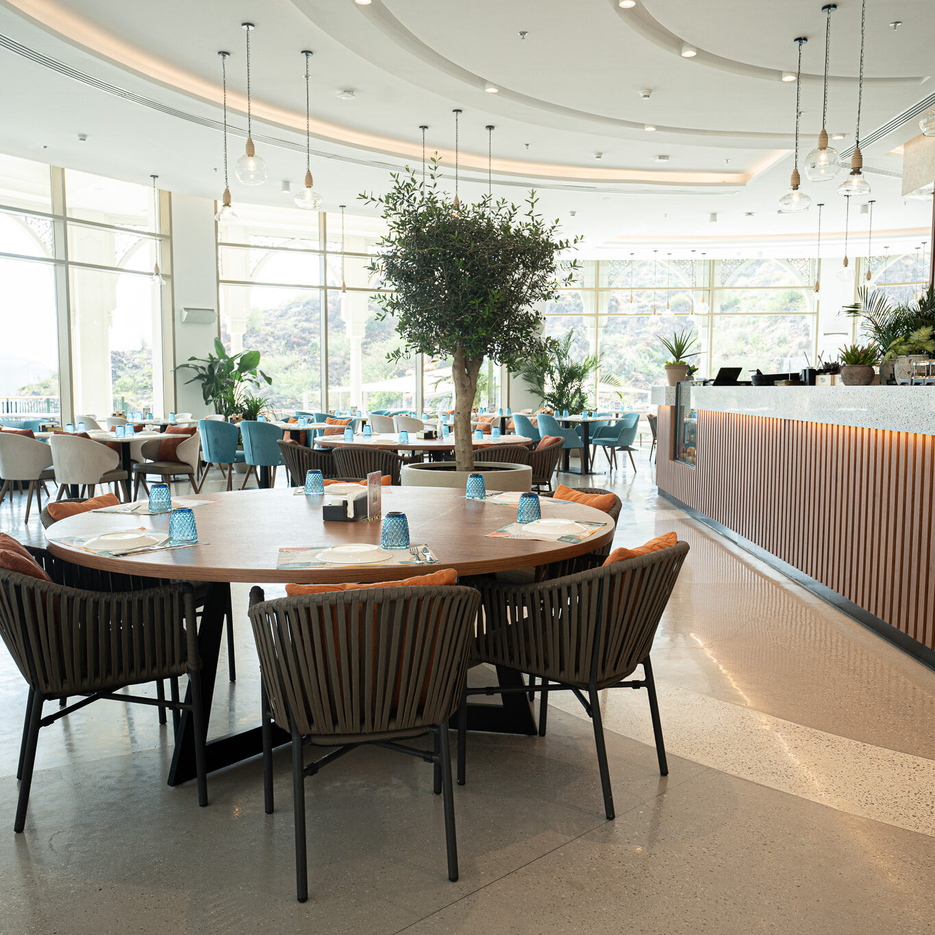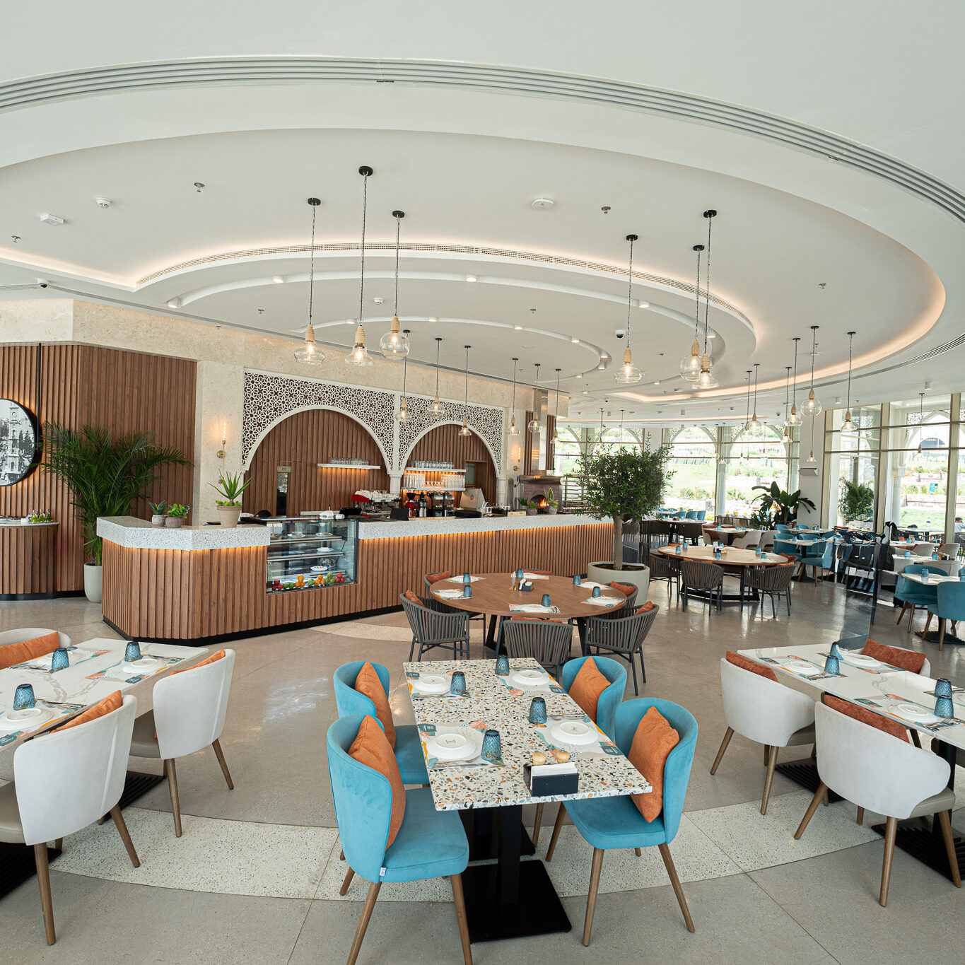 This restaurant is a seamless fusion of contemporary design and natural harmony. The architecture is defined by geometry, clean lines, open spaces, and a thoughtful interplay of light and shadow, creating a dynamic yet intimate dining experience. The interior design embraces a sophisticated palette of natural materials—stone, wood, and metal—enhanced by textural contrasts and subtle detailing. Expansive openings frame stunning views, while layered lighting and sculptural elements add depth and warmth.