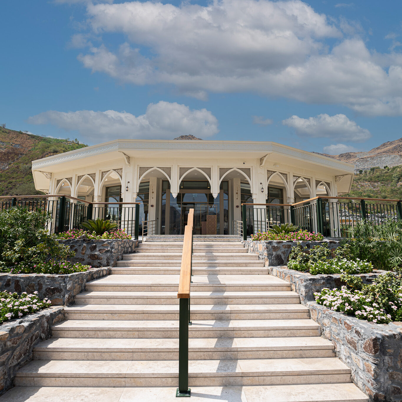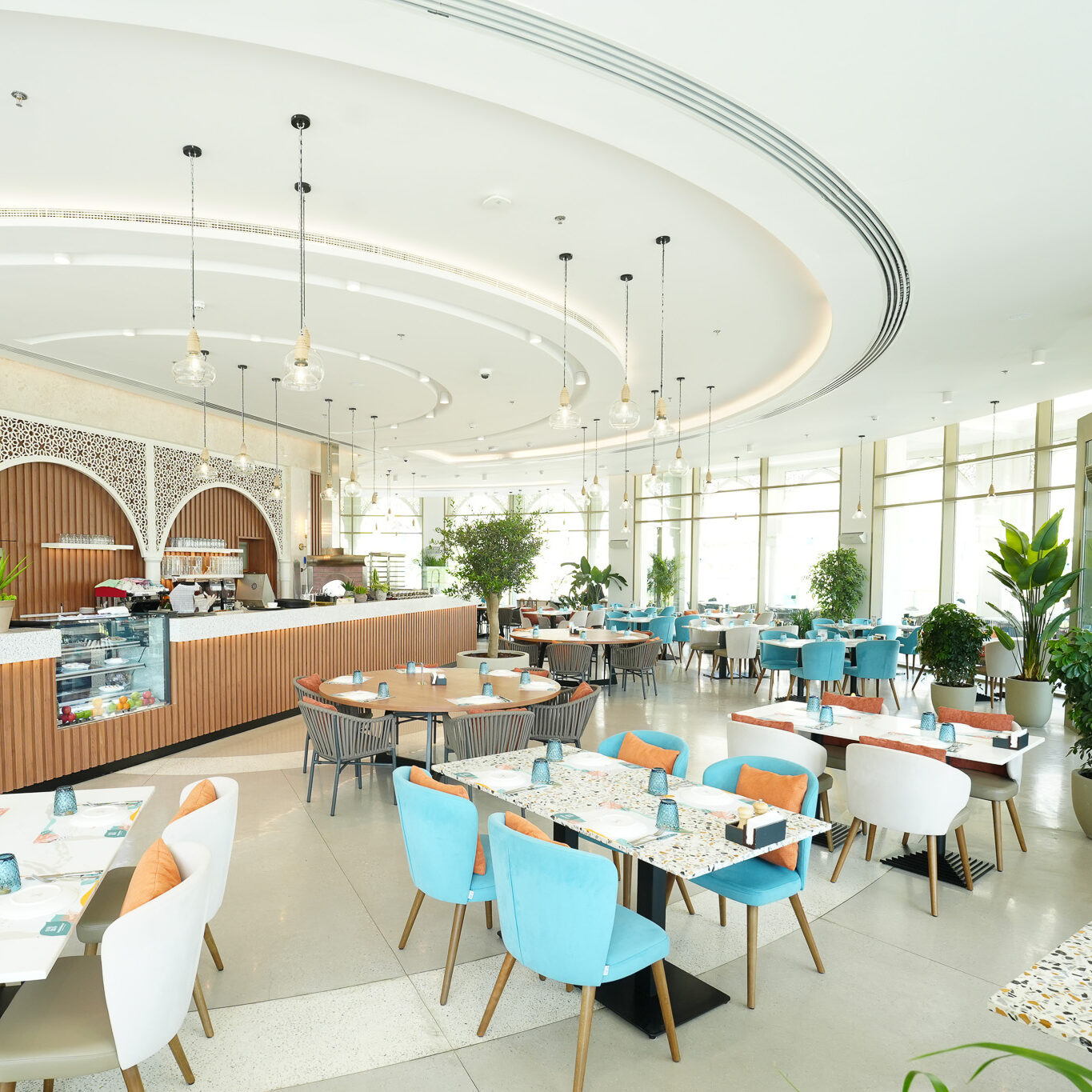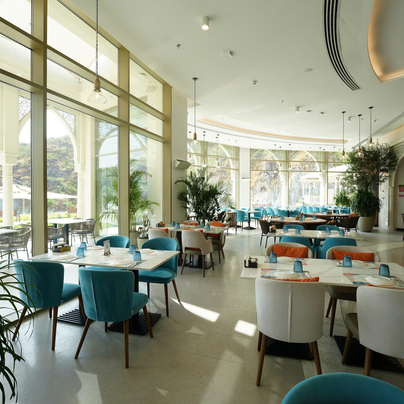 This restaurant is a seamless fusion of contemporary design and natural harmony. The architecture is defined by geometry, clean lines, open spaces, and a thoughtful interplay of light and shadow, creating a dynamic yet intimate dining experience. The interior design embraces a sophisticated palette of natural materials—stone, wood, and metal—enhanced by textural contrasts and subtle detailing. Expansive openings frame stunning views, while layered lighting and sculptural elements add depth and warmth.