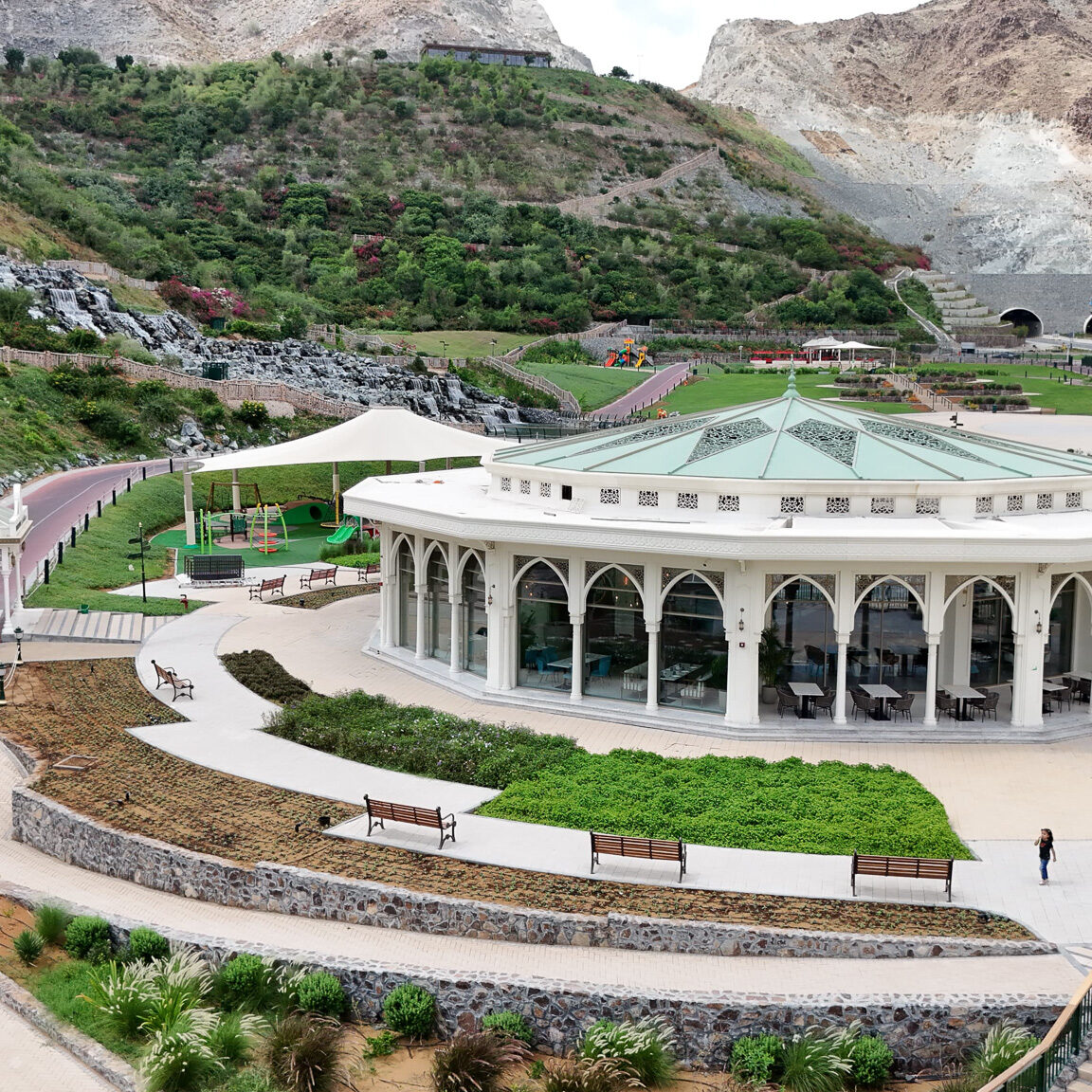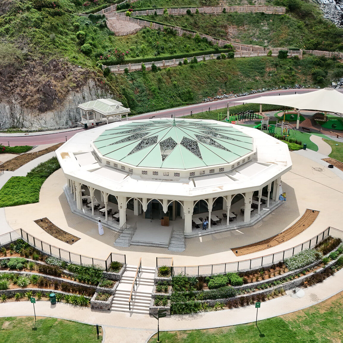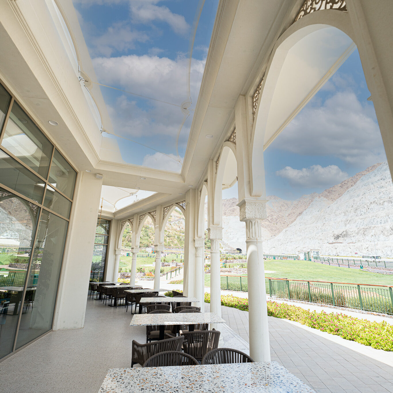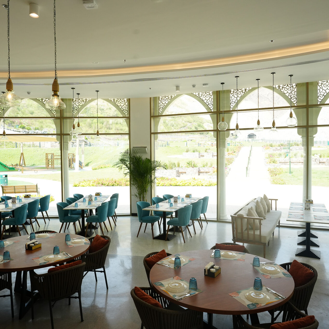 This restaurant is a seamless fusion of contemporary design and natural harmony. The architecture is defined by geometry, clean lines, open spaces, and a thoughtful interplay of light and shadow, creating a dynamic yet intimate dining experience. The interior design embraces a sophisticated palette of natural materials—stone, wood, and metal—enhanced by textural contrasts and subtle detailing. Expansive openings frame stunning views, while layered lighting and sculptural elements add depth and warmth.