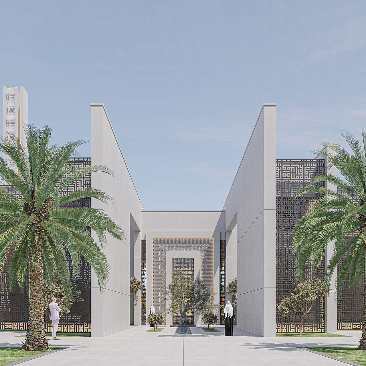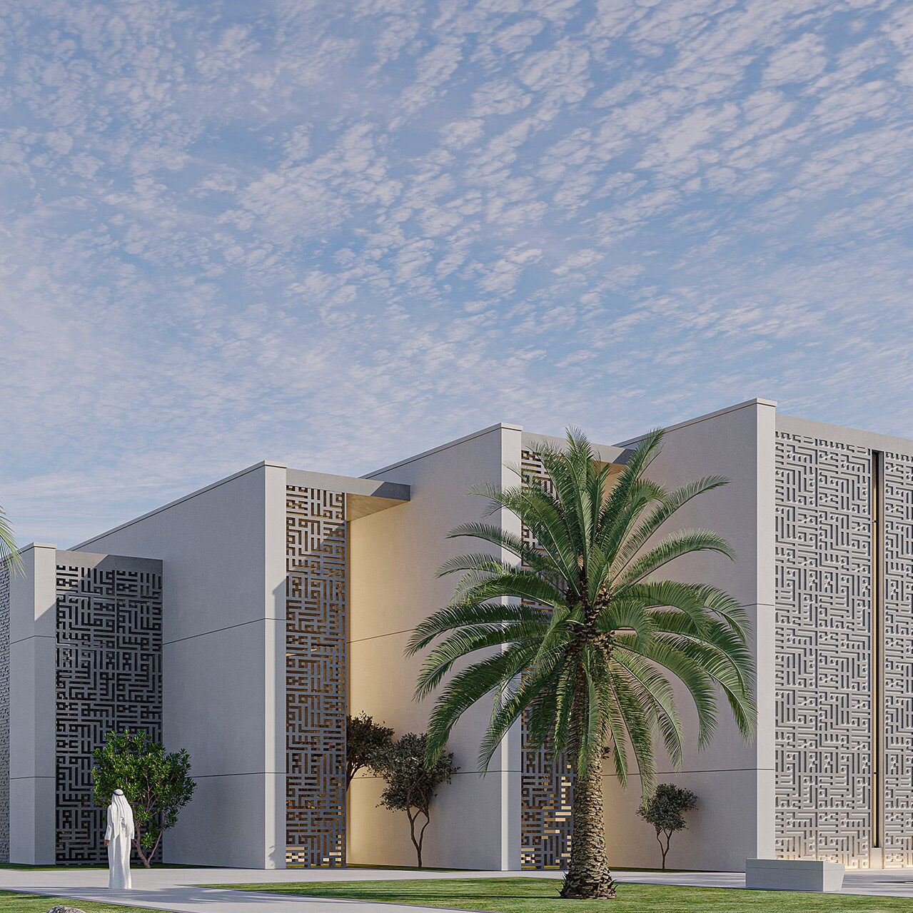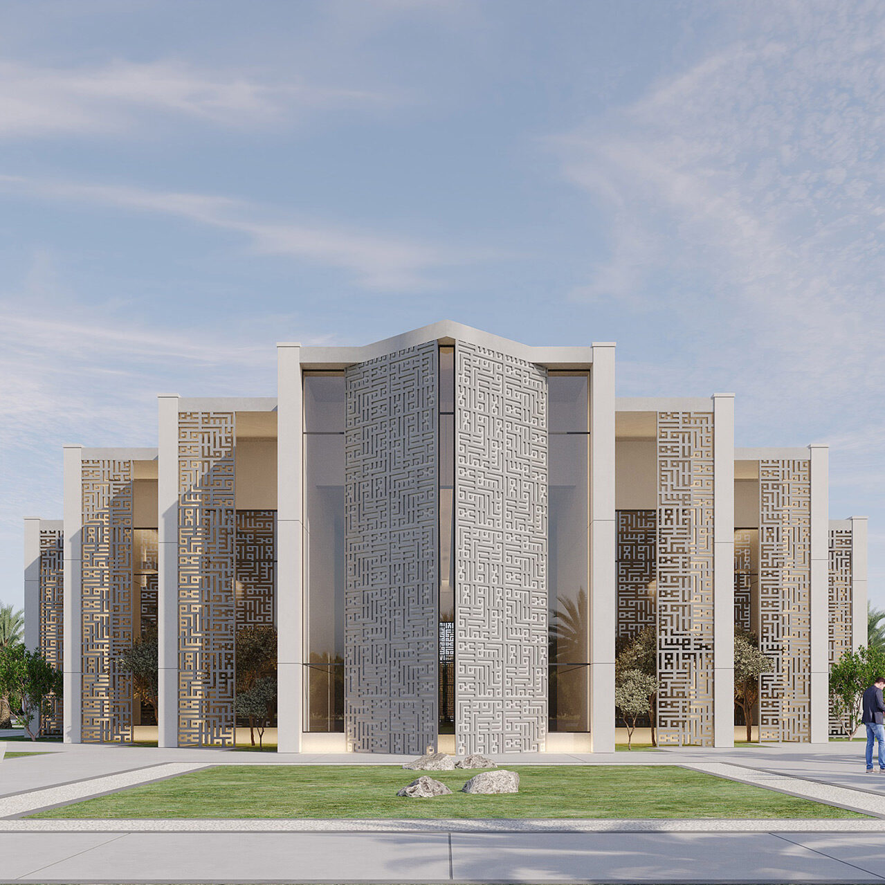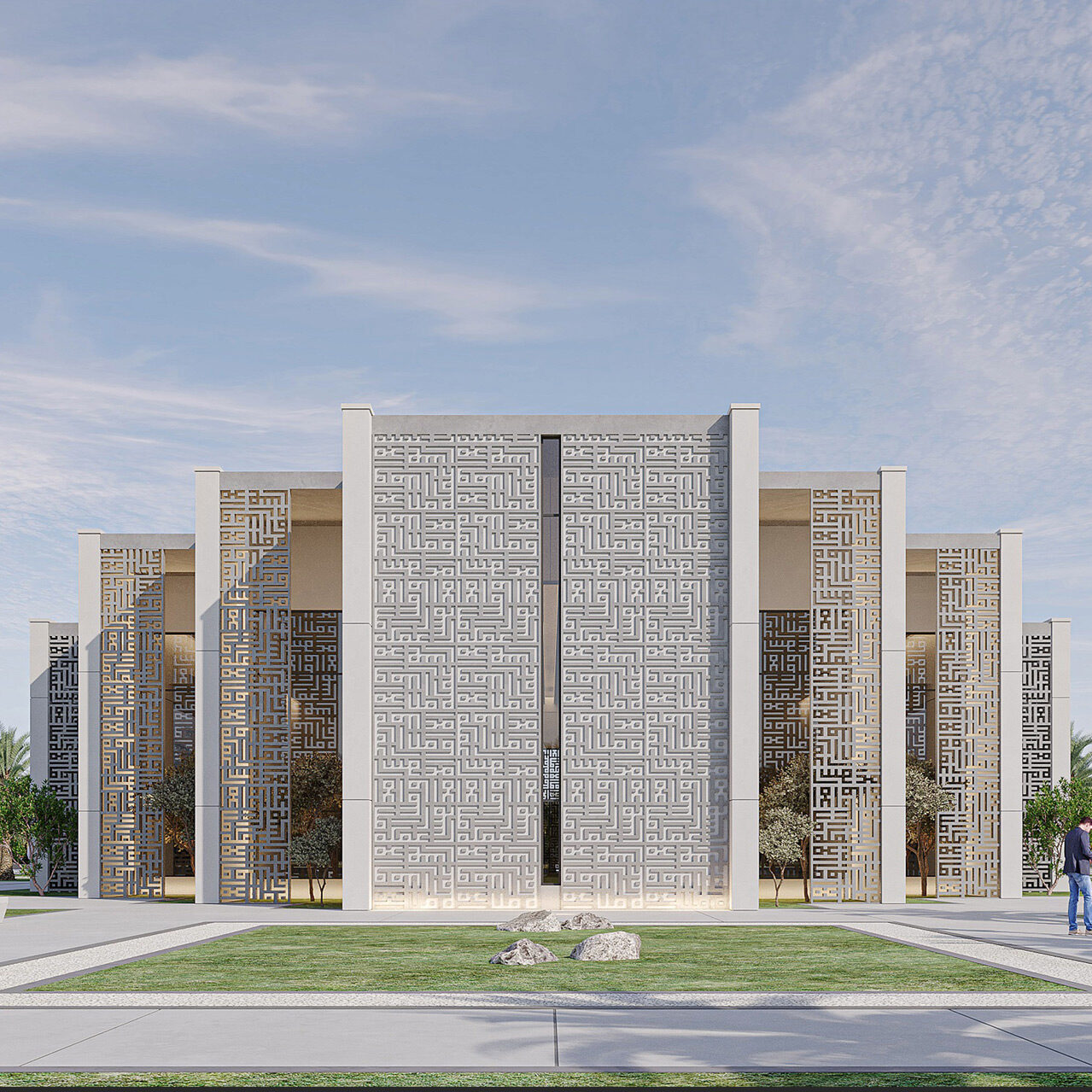 This contemporary mosque design harmonizes minimalist geometry with traditional Islamic artistry, featuring intricate sun breakers adorned with Kufic calligraphy. These perforated façades provide shade and ventilation while casting dynamic light patterns inside. A towering minaret, open courtyard, and lush landscaping create a serene and inviting spiritual atmosphere.