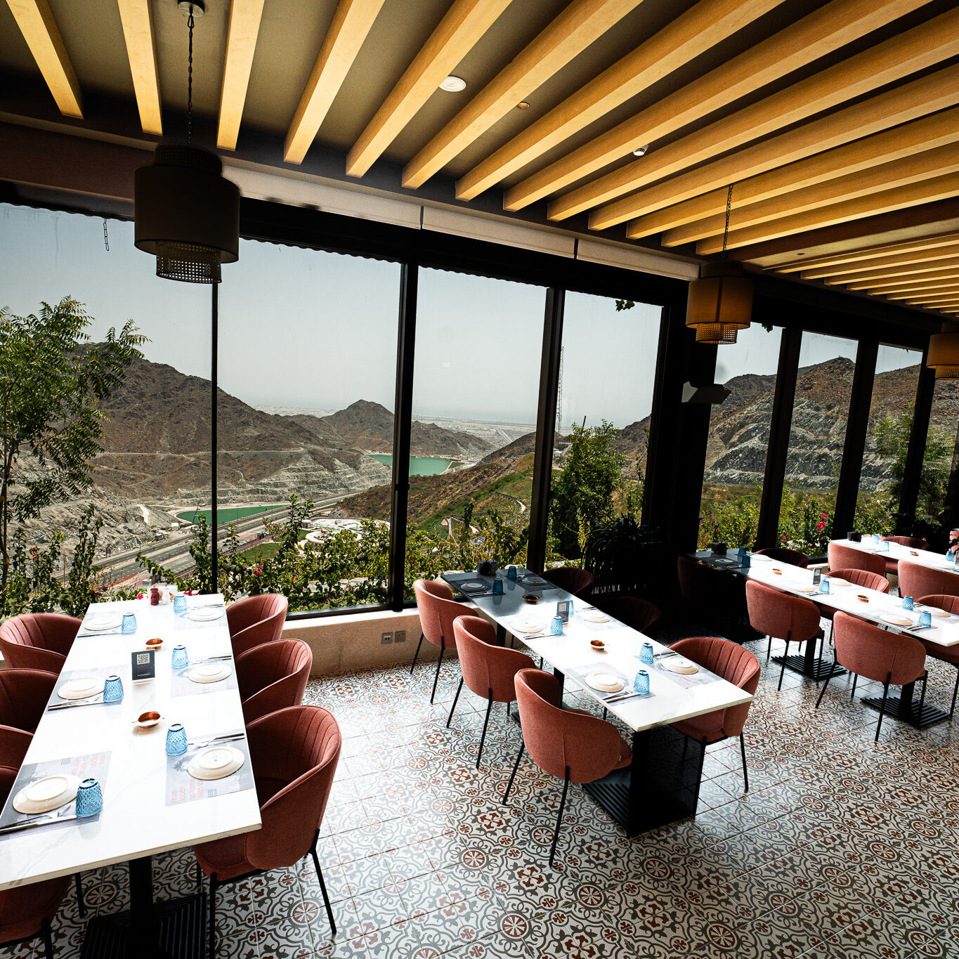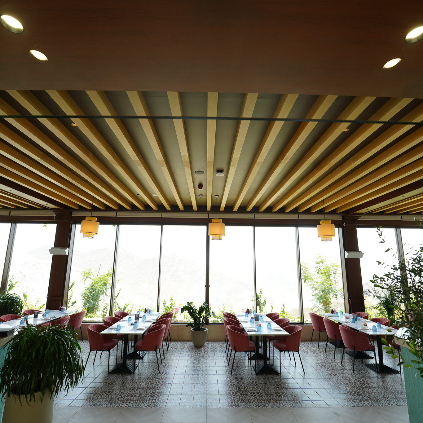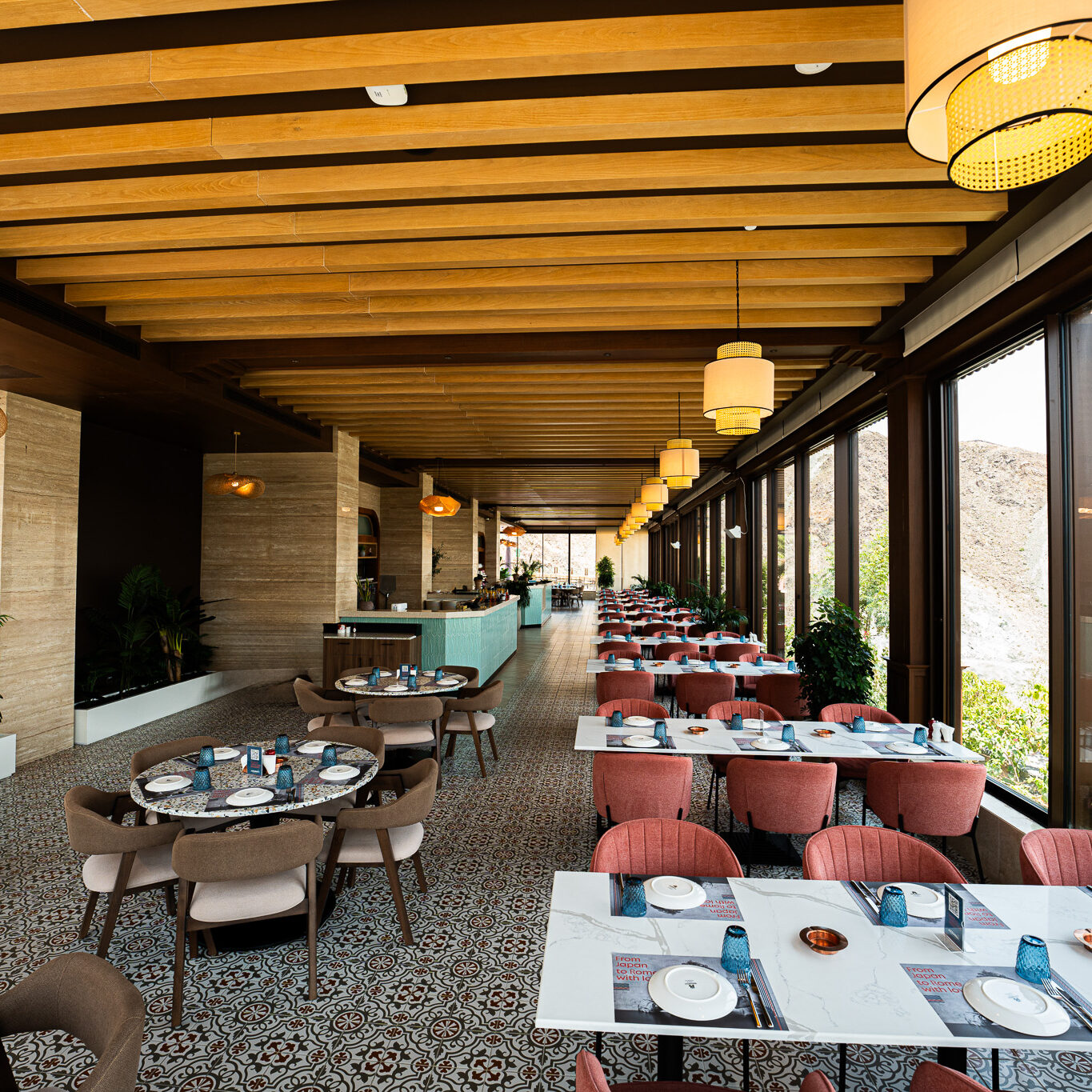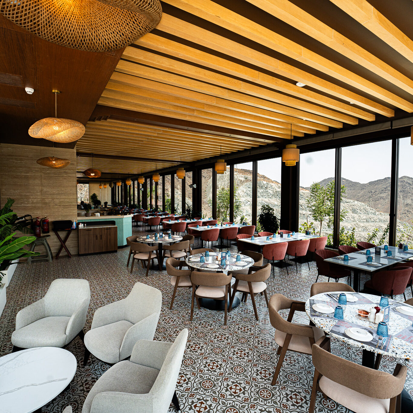 Perched atop the rugged landscapes of Kalba, the Upper Cafeteria in Hanging Garden offers a seamless blend of architecture and nature. With its panoramic glass walls, warm wooden interiors, and earthy textures, this elevated retreat provides breathtaking views of the surrounding mountains. A sanctuary of comfort and sophistication, it invites guests to enjoy a tranquil dining experience amidst nature.