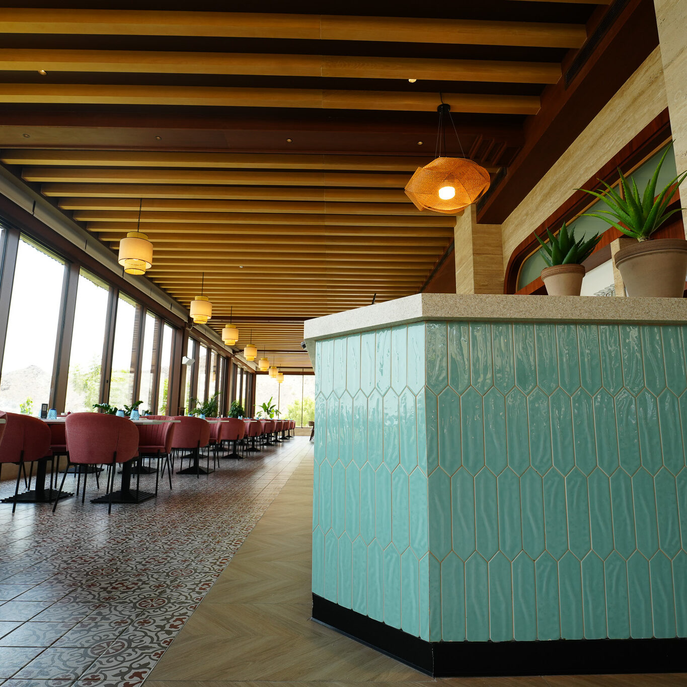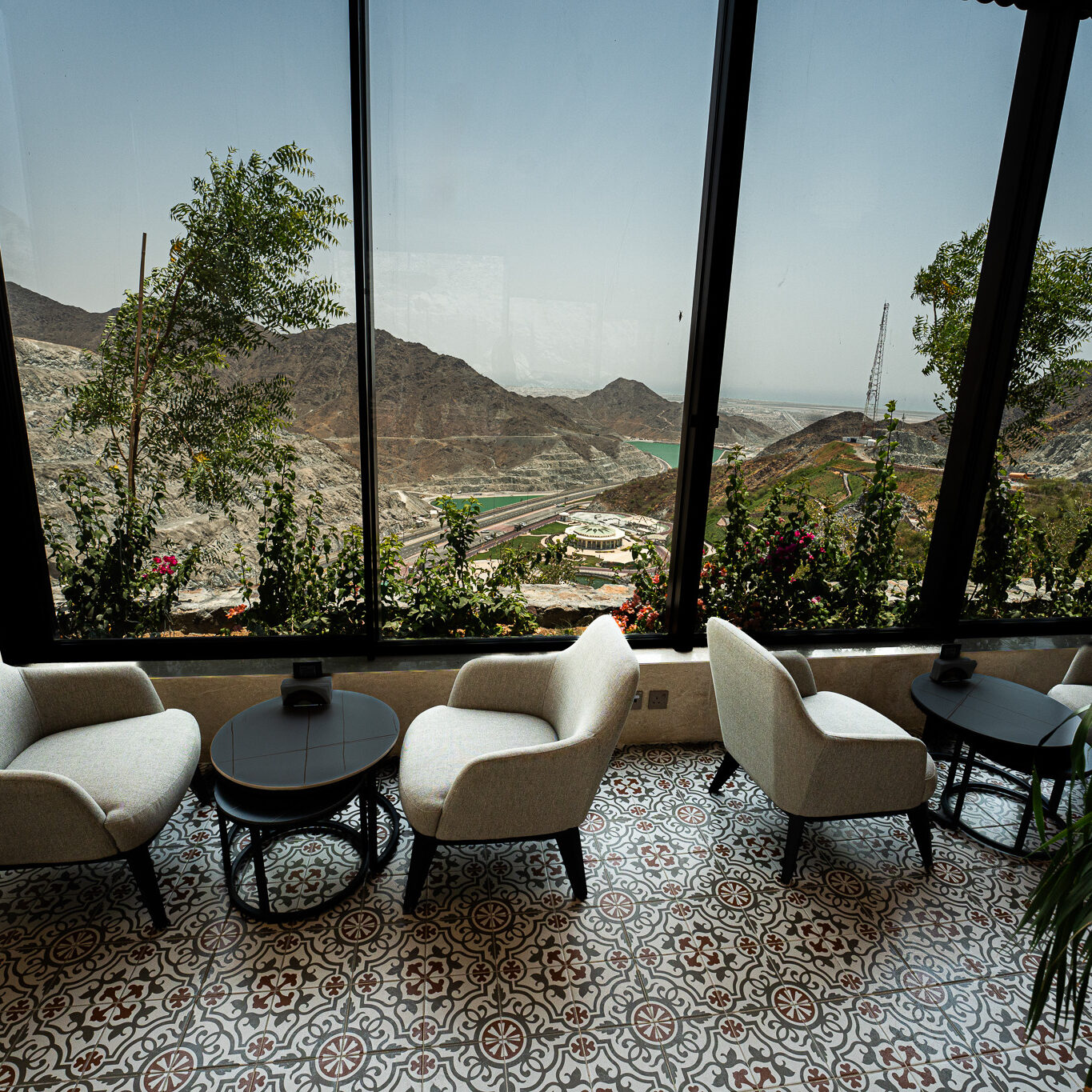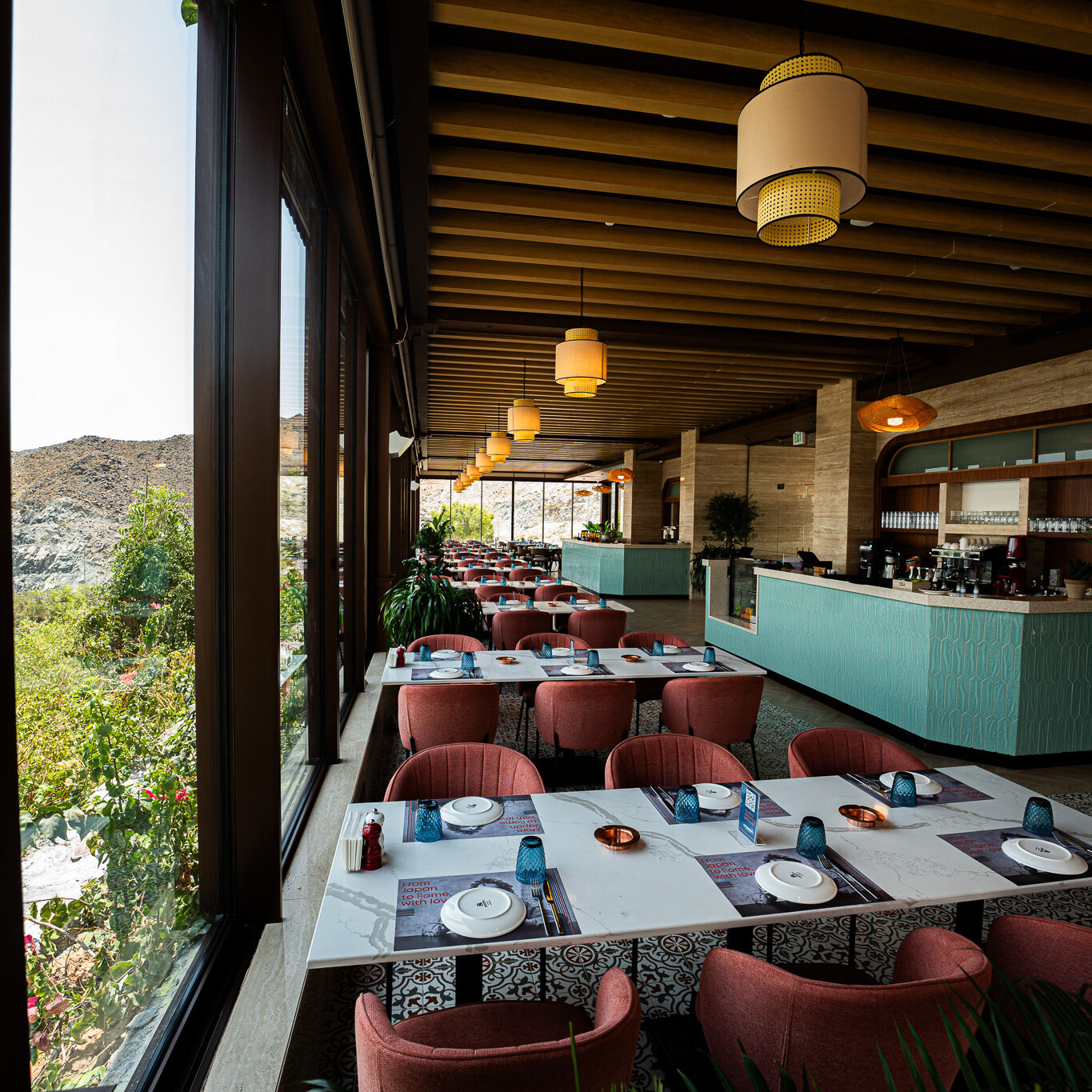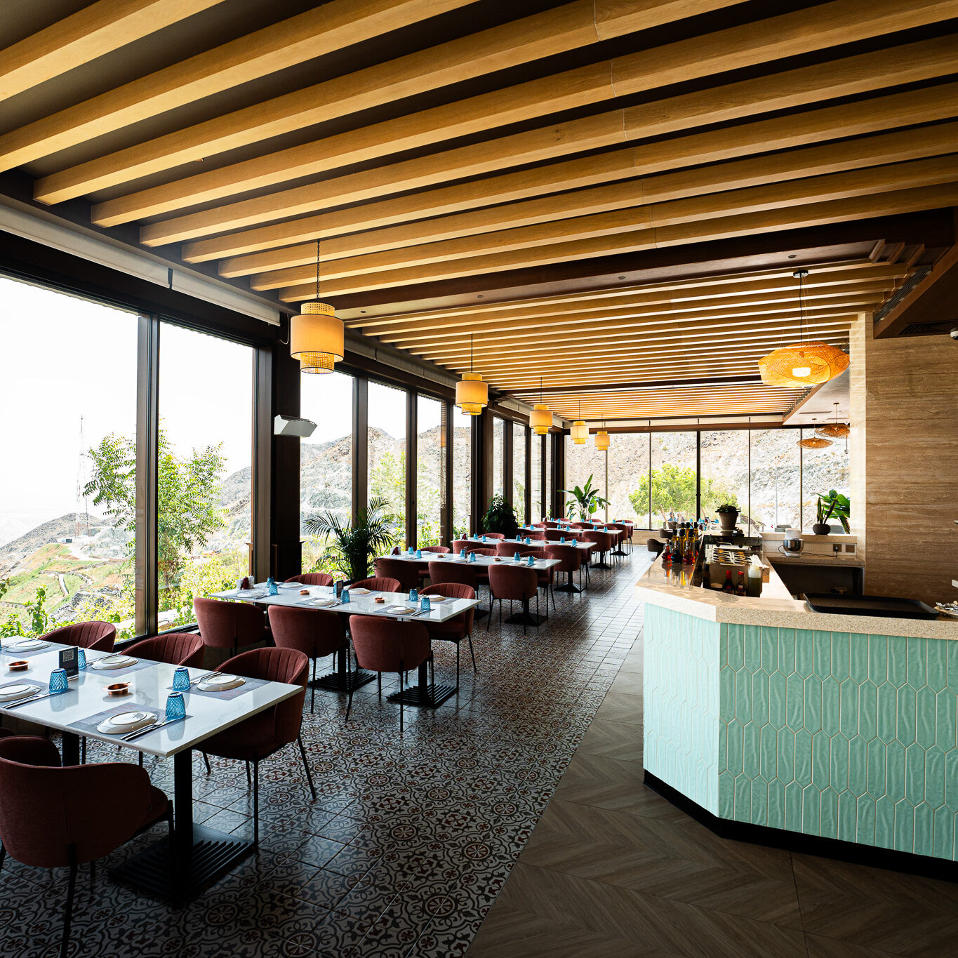 Perched atop the rugged landscapes of Kalba, the Upper Cafeteria in Hanging Garden offers a seamless blend of architecture and nature. With its panoramic glass walls, warm wooden interiors, and earthy textures, this elevated retreat provides breathtaking views of the surrounding mountains. A sanctuary of comfort and sophistication, it invites guests to enjoy a tranquil dining experience amidst nature.