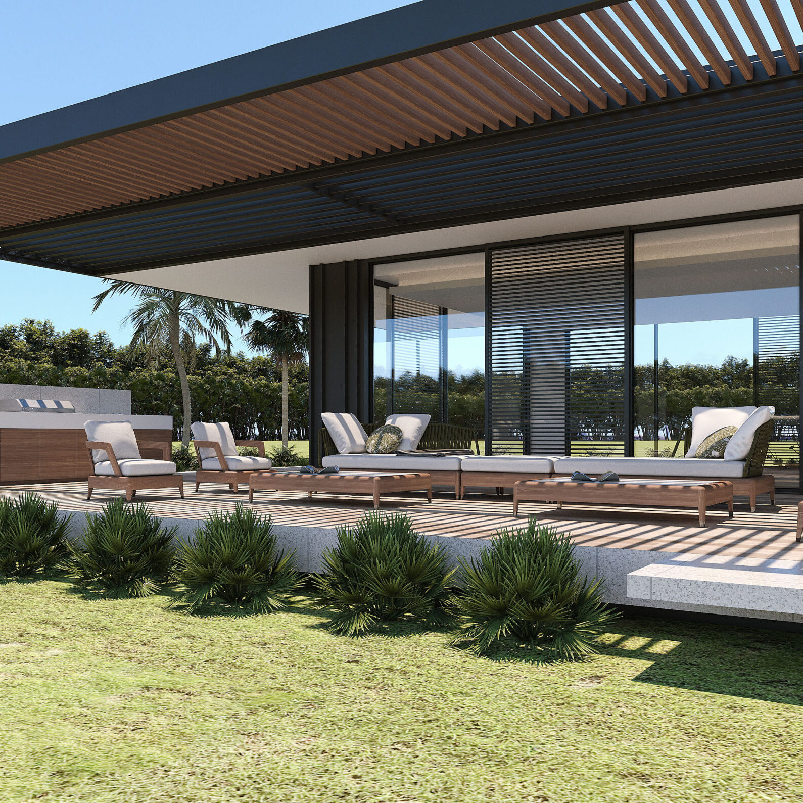 This architectural design emphasizes a fluid indoor-outdoor connection, achieved through expansive glass facades that blur the boundaries between the interior living space and the surrounding landscape.