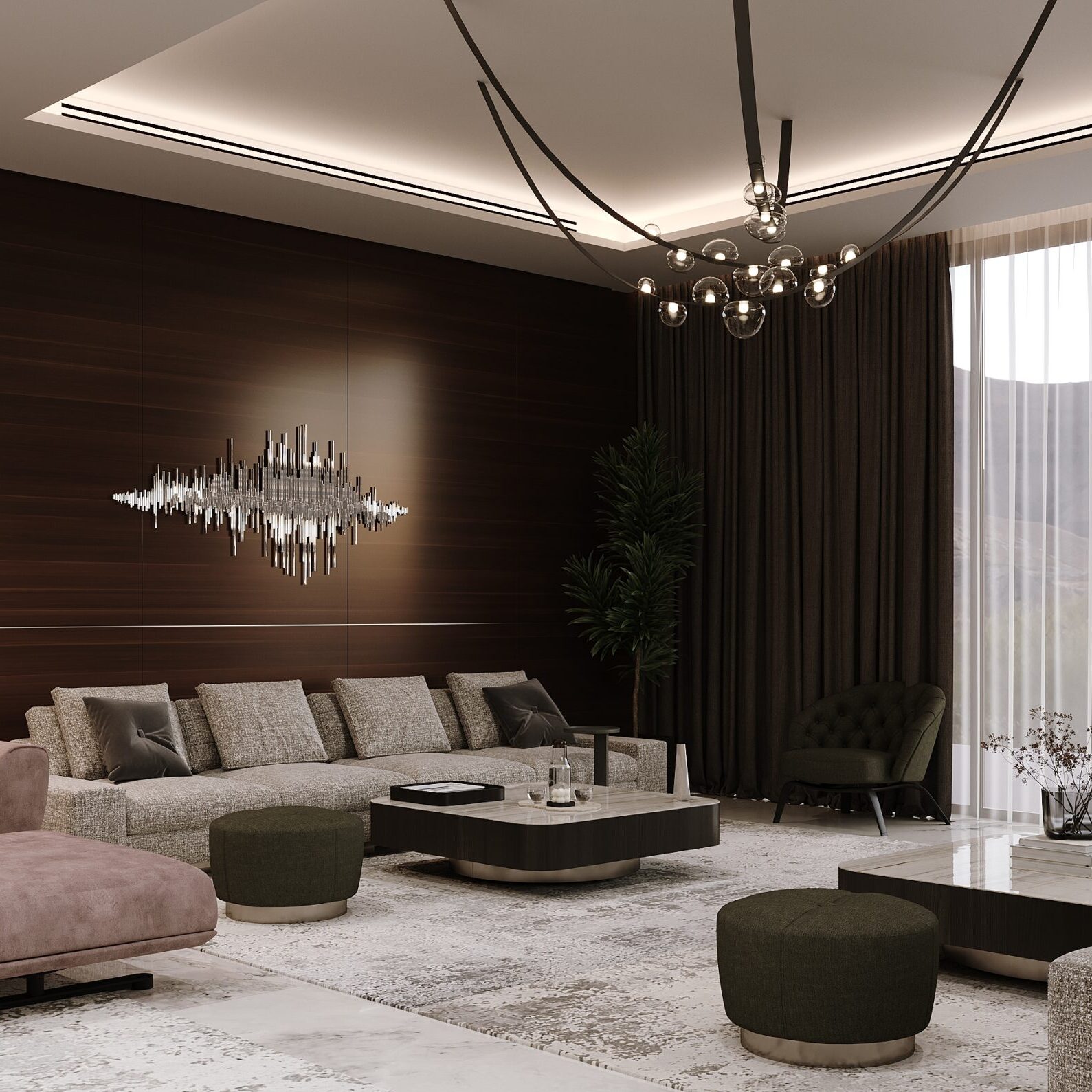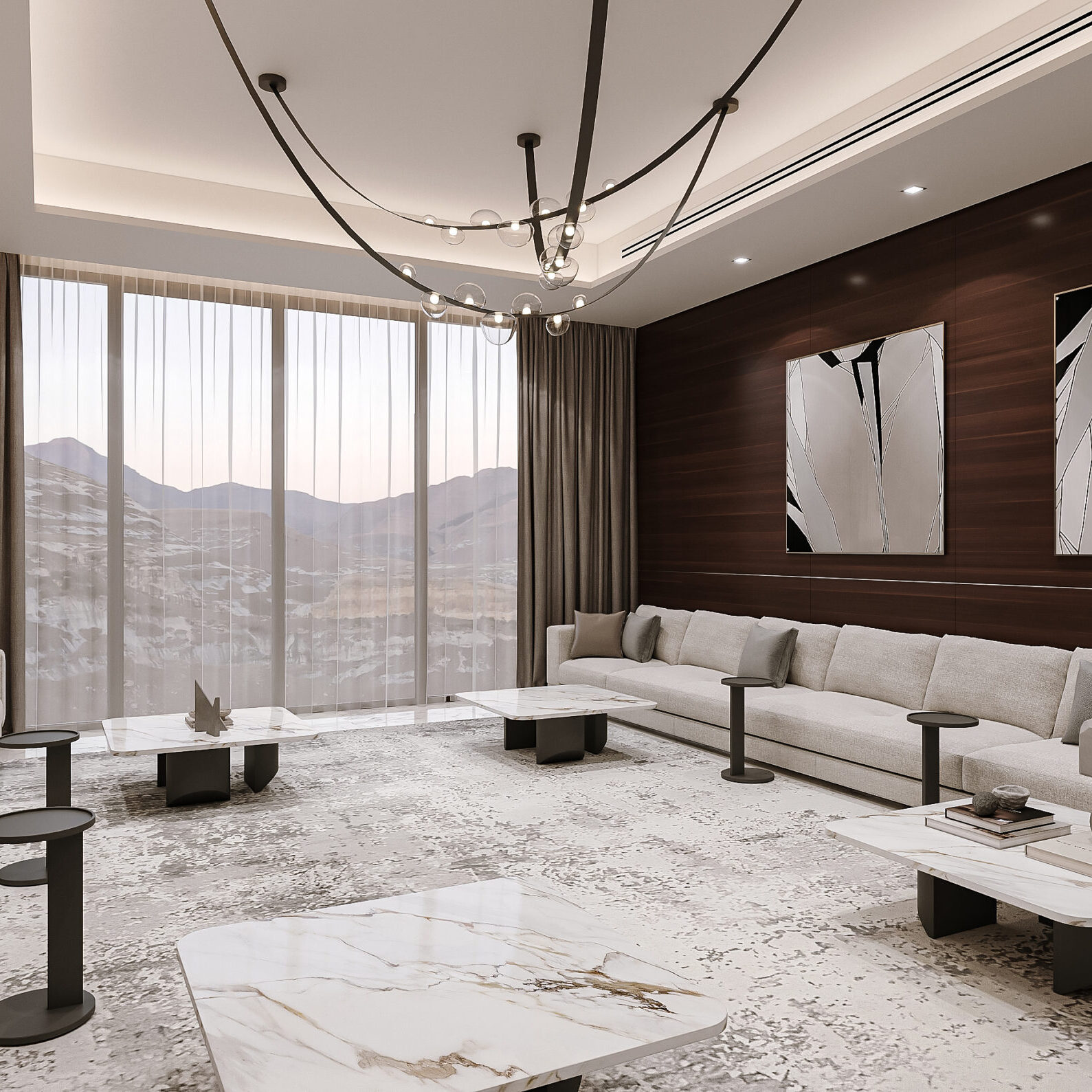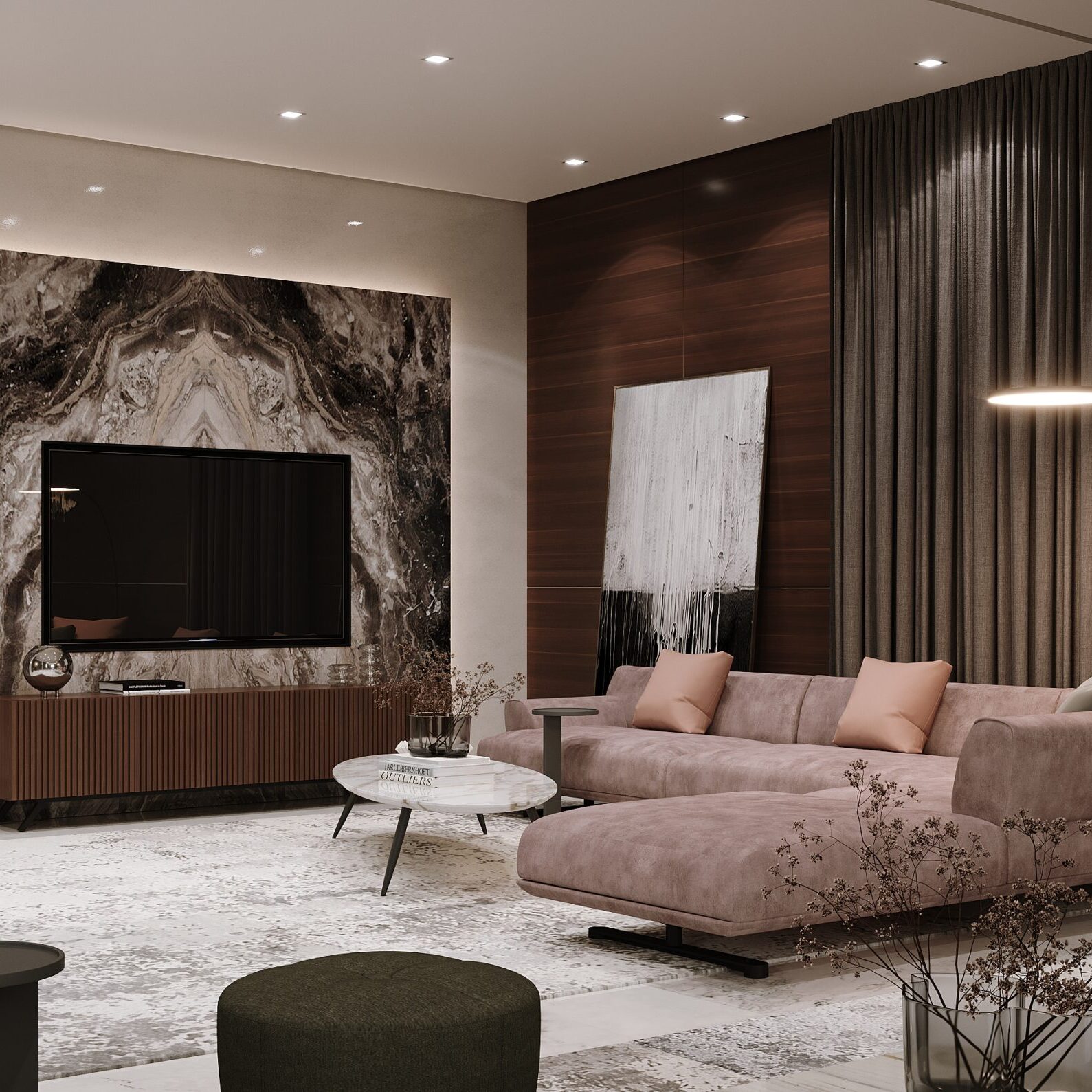 The villa combines sophistication, warmth, and modern luxury, creating an inviting and upscale ambiance. High-end materials like marble, glass, and wood add elegance, with dramatic stone accents and feature walls introducing an organic touch. The space is balanced, blending neutral and earthy tones with minimalist yet bold design elements, offering both style and comfort.