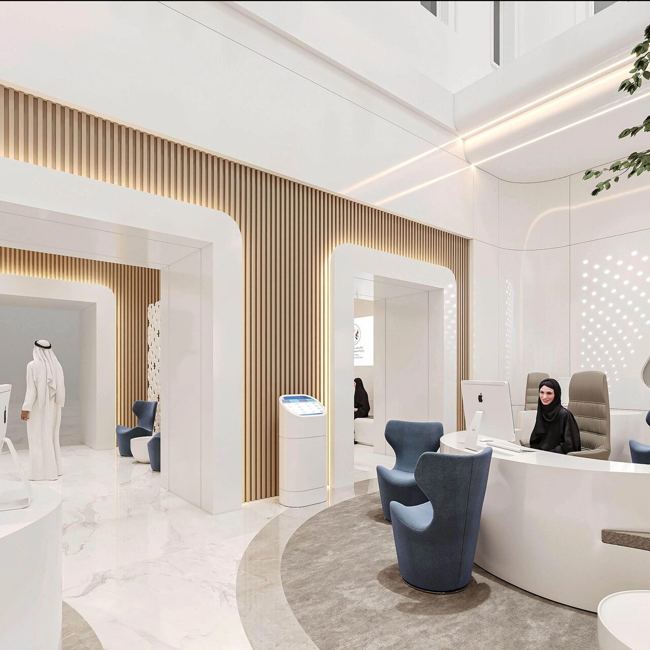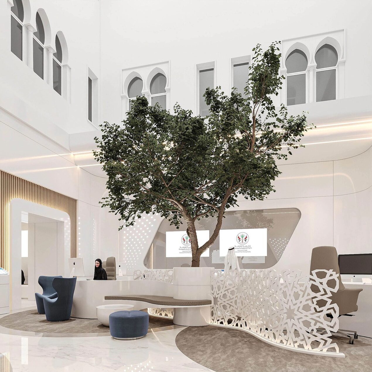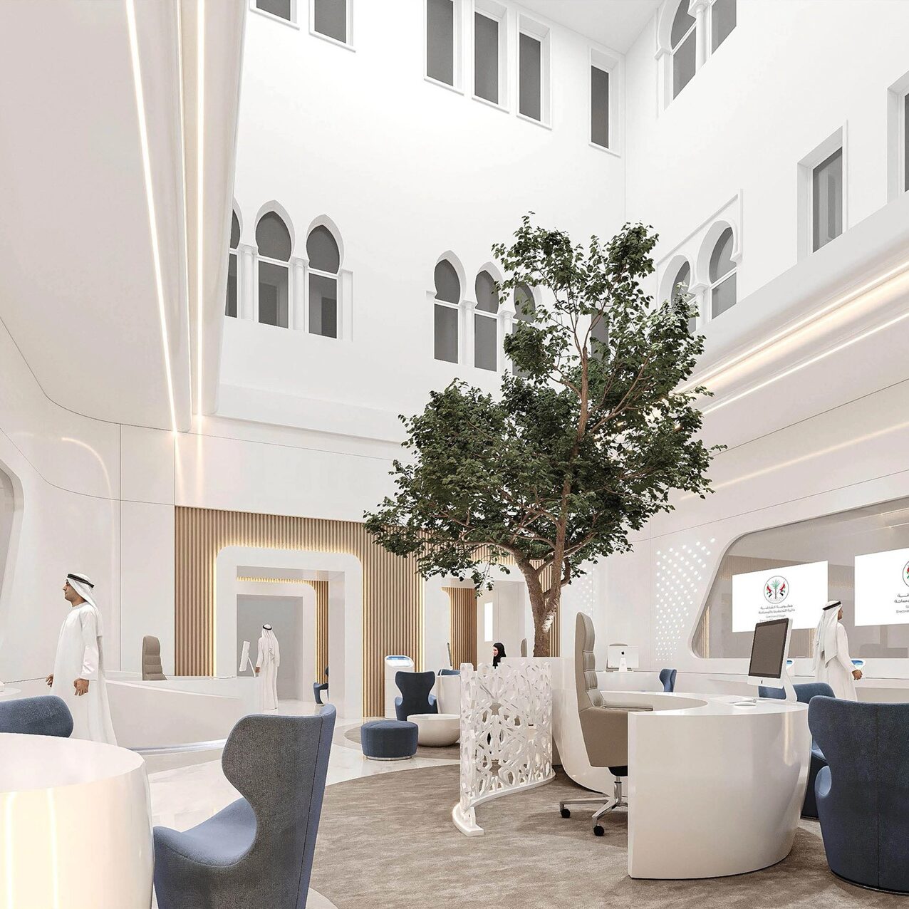 The design of this project showcases a sophisticated and modern office space with a high ceiling, incorporating a blend of contemporary and traditional elements. A central tree acts as a natural focal point, surrounded by sleek white furniture, intricate patterned partitions, and warm wooden accents, creating an inviting and elegant ambiance. Soft ambient lighting and arched windows add a touch of heritage, harmonizing with the clean lines and futuristic aesthetics of the workspace.